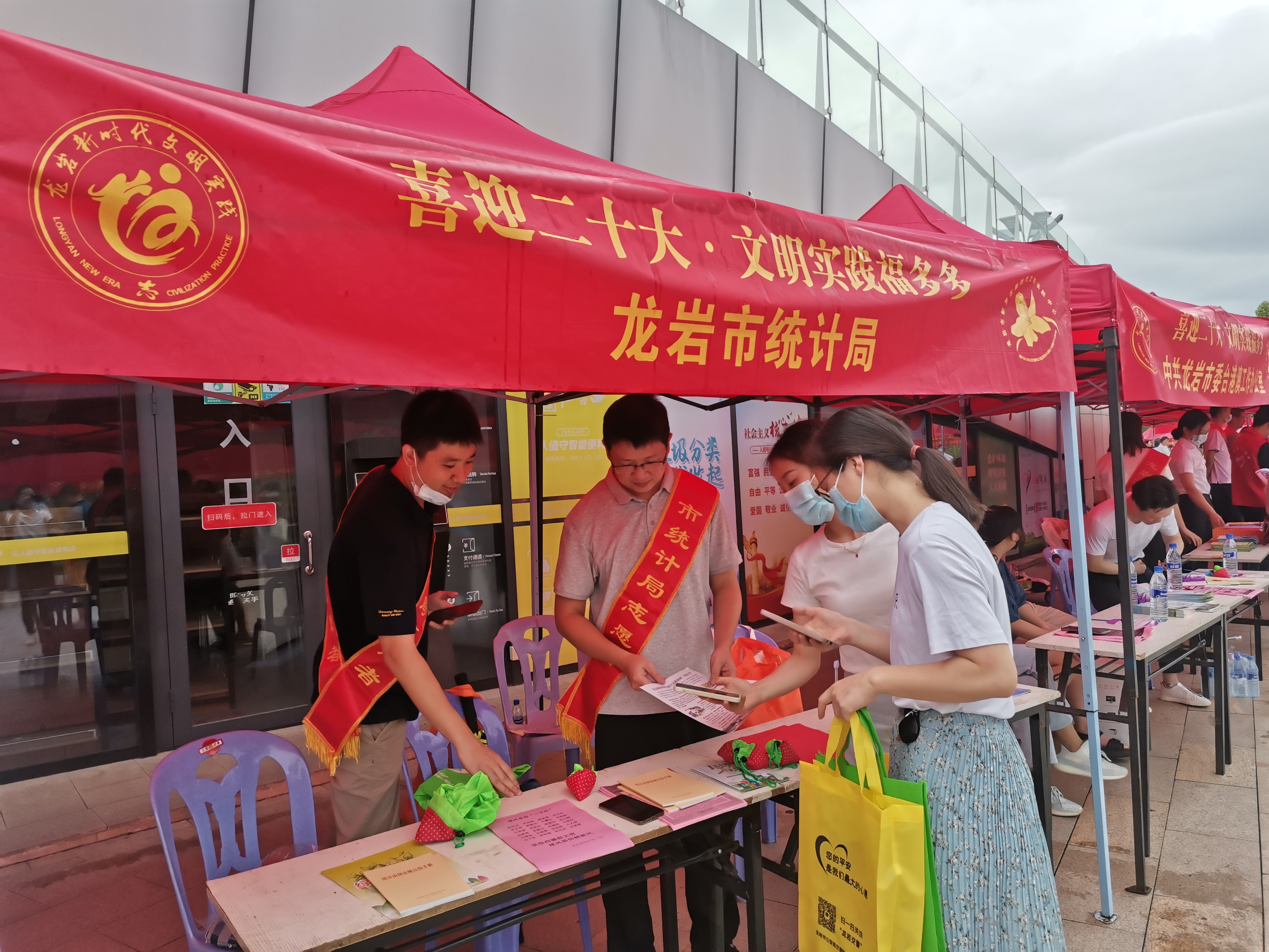 二是举办现场宣传活动。 7月5日,在龙津湖举办“喜迎二十大·文明实践福多多”系列活动,市统计局志愿者通过发放移风易俗倡议书、统计法律法规、民法典、《统计严重失