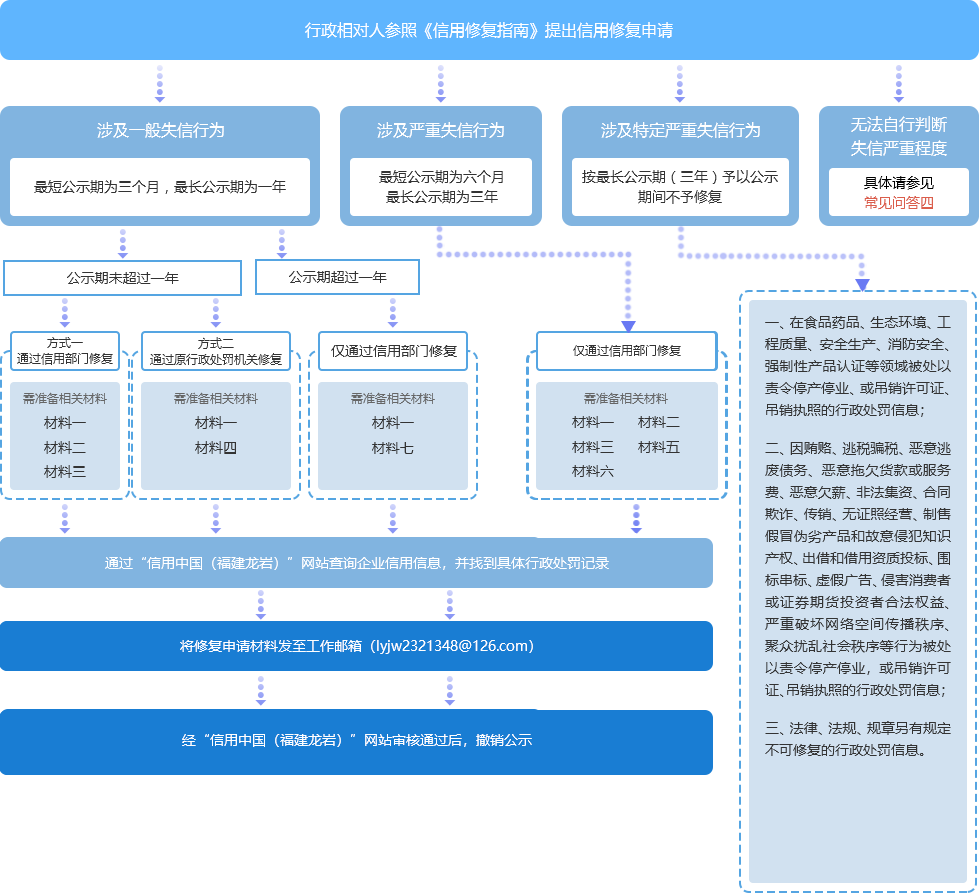 为引导失信主体规范、便捷办理信用修复,维护信用主体合法权益, 根据《失信行为纠正后的信用信息修复管理办法(试行)》(国家发展改革委令第58号)相关规定, 自2023年5月1日起,法人及非法人组织行政处罚信息信用修复均在“信用中国”网站在线提交修复申请, 根据要求上传修复申请材料(可从信用中国网站下载,具体网址:https://www.creditchina.gov.cn/xyxf/lczy/)。 咨询电话:0597-2999287